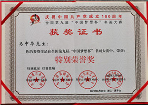 马中华2021年荣获全国第九届“中国梦想杯”书画大赛特别荣誉奖