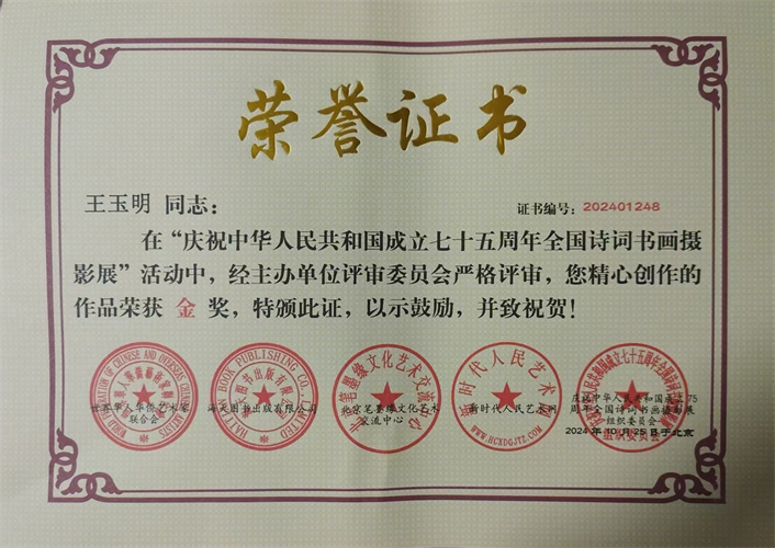 焦念良的徒弟王玉明,孙善涛同获<庆祝中华人民共和国成立75周年全国诗词书画摄影展>金奖并荣获<新时代人民艺术家>光荣称号。
