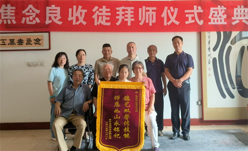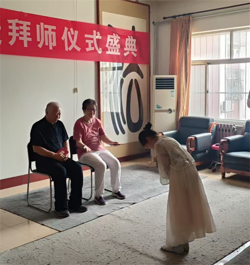 师父师母正襟上座,新弟子夏婉婷手捧《拜师帖》宣读,随后为师父敬赠“德艺双馨传技能,师恩如山永铭记”锦旗;三鞠躬、敬香茶,礼敬师道;焦念良先生与张书凤女士为夏婉婷颁发《师徒结缘传承证书》及《回徒帖》,正式确立师徒名分;师父亲书八尺长屏《学海无涯》并赠《学习记录本》,勉励弟子“以笔墨丈量世界”;师母宣读《回徒帖》,师父并赐弟子字号“申书”、雅号“黄河墨香”,寄望其“以黄河之襟怀,蕴墨香之隽永”。