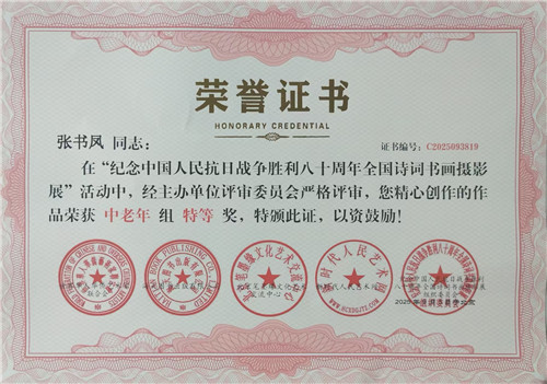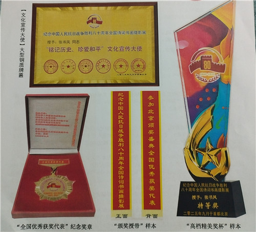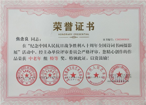 焦念良张书凤夫妻同获<纪念中国人民抗日战争胜利80周年全国诗词书画摄影展>特等奖并受邀参加11月8日北京国际会展中心举办的书画展和颁奖盛会。