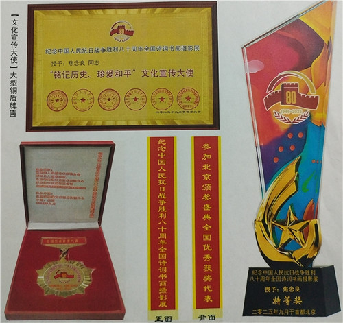 焦念良的徒弟王玉明.孙善涛,候传学.夏婉婷荣获<纪念中国人民抗日战争胜利80周年全国诗词书画摄影展>金奖银奖并受邀参加11月8日北京国际会展中心举办的书画展和颁奖盛会。