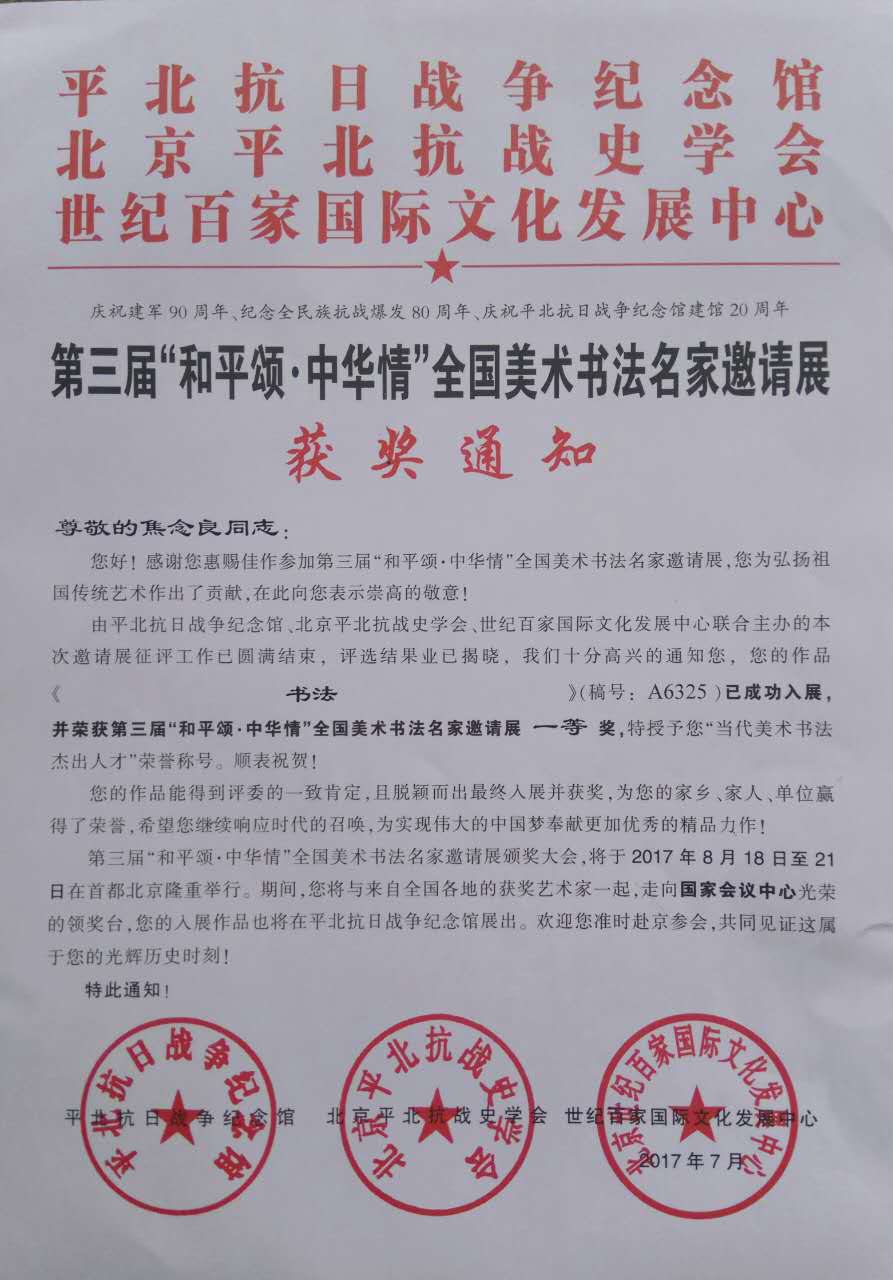 今天2017年8月4日收到,《平北抗日战争纪念馆》和《北京平北抗日史学会》第三届”和平颂、中华情”全国美术书法名家邀请展组委会的获奖文件, 焦念良及夫人张书凤分别荣获一等奖和二等奖。