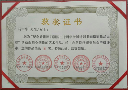 内容今天、收到了“纪念香港回归祖国20周年全国诗词书画摄影作品大赛”组委会发来的获奖文件。一鸣画院院长马中华荣获“纪念香港回归祖国20周年全国诗词书画摄影作品大赛”金奖。并邀请马中华院长在10月16日至10月21日赴香港参加颁奖盛会和笔墨缘笔会以及参加来京代表和领导及各界名家合影,接受“中国当代红色爱国艺术家奖章” 终身成就获奖证书、奖盘、奖杯。